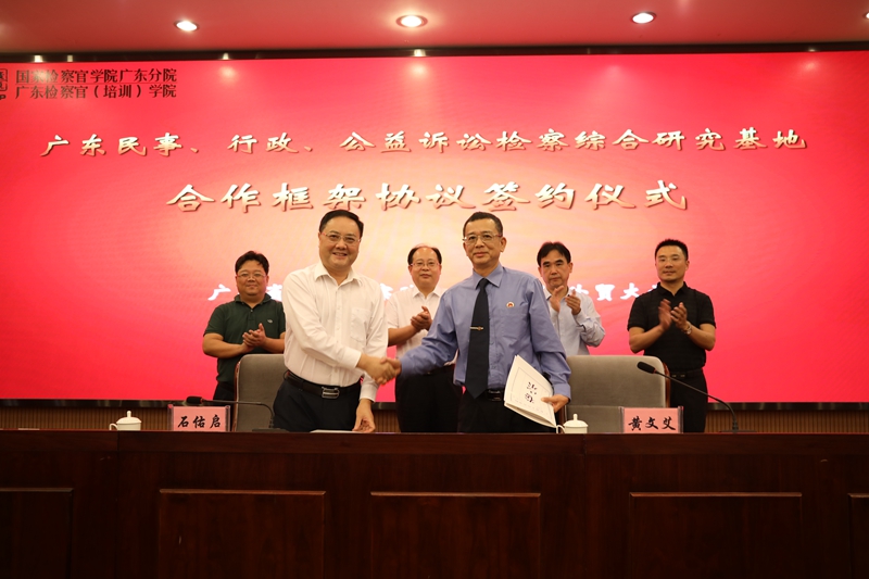 央廣網(wǎng)廣州10月19日消息(記者鄭澍 通訊員王磊)10月19日下午,廣東民事、行政、公益訴訟檢察綜合研究基地合作框架協(xié)議簽約儀式在國家檢察官學(xué)院廣東分院舉行,最高人民檢察院第七檢察廳廳長張相軍蒞臨現(xiàn)場見證儀式。廣東省人民檢察院副檢察長黃文艾、廣東外語外貿(mào)大學(xué)校長石佑啟出席儀式并致辭,最高人民檢察院第七檢察廳辦公室主任馮孝科、廣東省人民檢察院第七檢察部主任馬謹(jǐn)斌、國家檢察官學(xué)院廣東分院常務(wù)副院長林武衡出席簽約儀式。