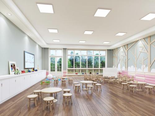 園內(nèi)普通教室均有落地飄窗,保證通透采光,與近水走廊相連,課堂上能觀賞對岸風(fēng)光;專項教室涵蓋閱覽、音樂、烹飪、美工、科學(xué)等各類課程,為孩子們營造充足的活動空間;戶外區(qū)域面積達(dá)二十多畝,以樟樹為主打造森林氛圍,其獨有的水塘能提供水生自然的學(xué)習(xí)資源,另設(shè)種植、養(yǎng)殖區(qū)塊,在天然的稻田中能與小動物相互親近。