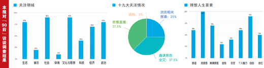 在訪問(wèn)中,很多受訪者將“成就感”、“自由”、“美滿(mǎn)家庭”、“舒適”等作為理想人生要素。因此,很多“90后”的政治參與意識(shí)、對(duì)黨和國(guó)家大事的關(guān)注度更高。調(diào)查中,80%的受訪者表示“關(guān)注了十九大”,其中近75%的人表示“收看了現(xiàn)場(chǎng)直播”或“通讀了報(bào)告全文”。