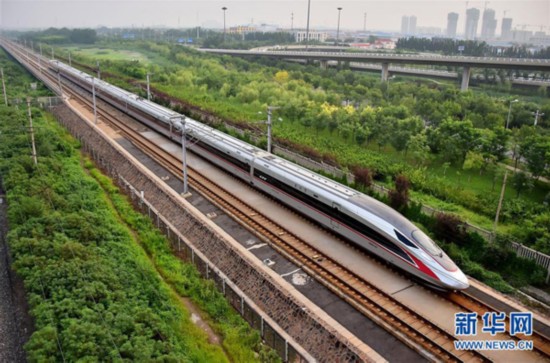 北京南開往天津的C2001次“復(fù)興號(hào)”中國標(biāo)準(zhǔn)動(dòng)車組駛?cè)胩旖蚴袇^(qū)。新華社記者楊寶森攝