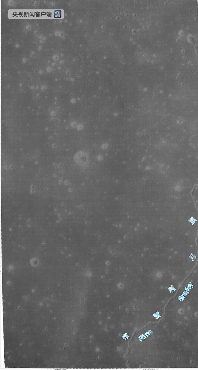 。ㄓ跋駡D位于雨海西南部,寬約30.5千米,長約57.1千米。該區(qū)域表面較平坦,分布有小型環(huán)形坑,其中最大的環(huán)形坑直徑約1.9千米。影像圖右下角較為明顯的月貌特征為布雷利月溪的局部,在影像圖中的長度約為36.2千米)