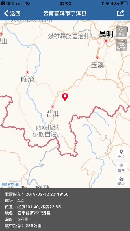 據(jù)中國地震臺網正式測定:2019年02月12日22時49分56秒在云南普洱市寧洱縣(黎明鄉(xiāng))(北緯22.85度、東經101.40度)發(fā)生4.4級地震,震源深度5公里。據(jù)了解,震中位于寧洱縣的黎明鄉(xiāng),離縣城有42公里,所以寧洱縣城震感不是很強烈。具體受災情況正在進一步核實中。(央視記者 李常明)