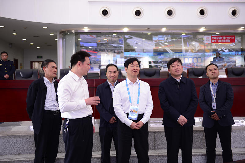 交通運輸部副部長劉小明(前排左二)在湖北省交通運輸廳廳長朱漢橋(前排左三)的陪同下,來到湖北省高速公路應(yīng)急處置服務(wù)中心檢查指導(dǎo)工作。(央廣網(wǎng)發(fā) 詹楓 攝)
