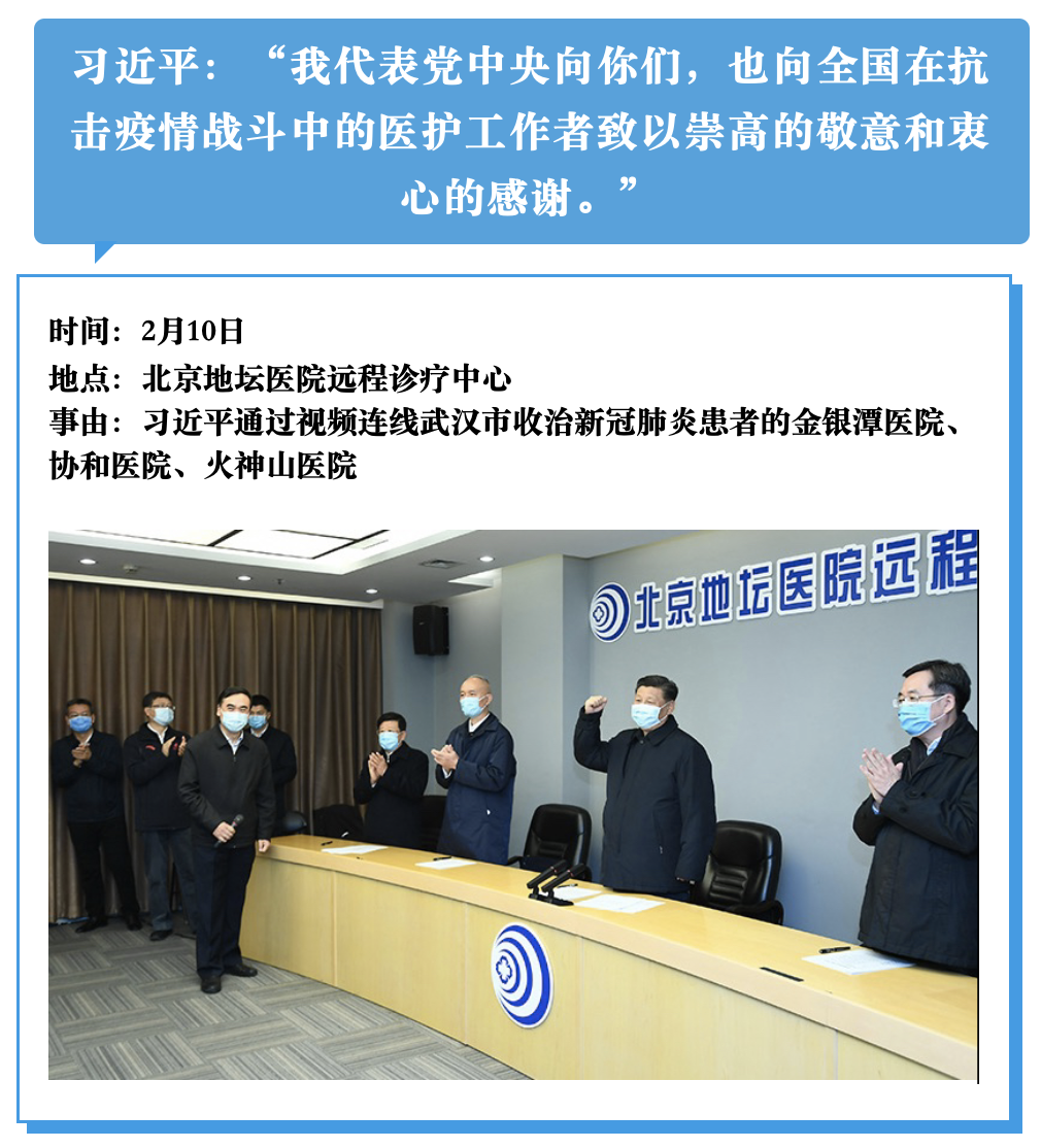 2月10日,習近平在北京市調(diào)研指導新冠肺炎疫情防控工作時,通過視頻連線武漢市收治新冠肺炎患者的金銀潭醫(yī)院、協(xié)和醫(yī)院、火神山醫(yī)院,向疫情防控一線的醫(yī)務工作者、干部職工和人民解放軍指戰(zhàn)員了解情況、聽取意見和建議。