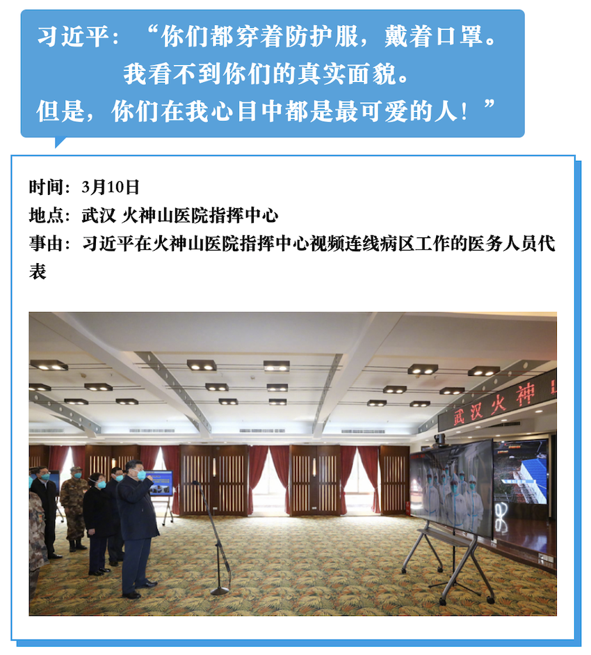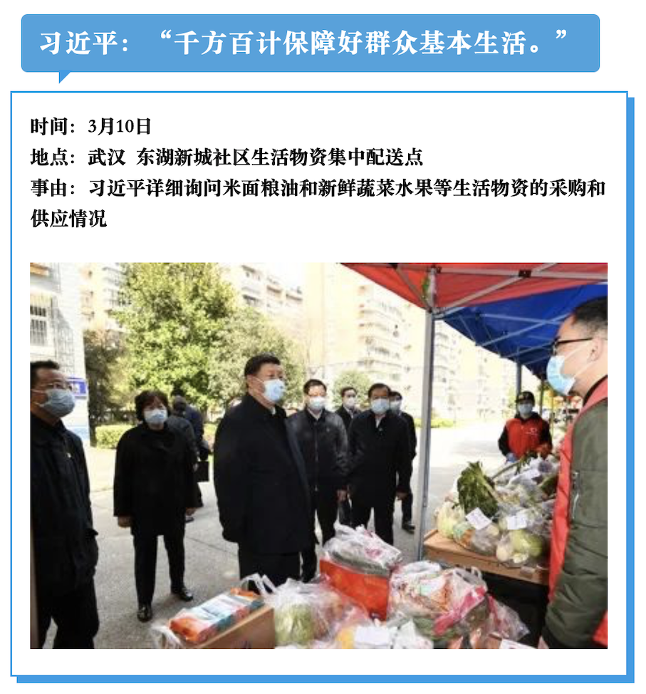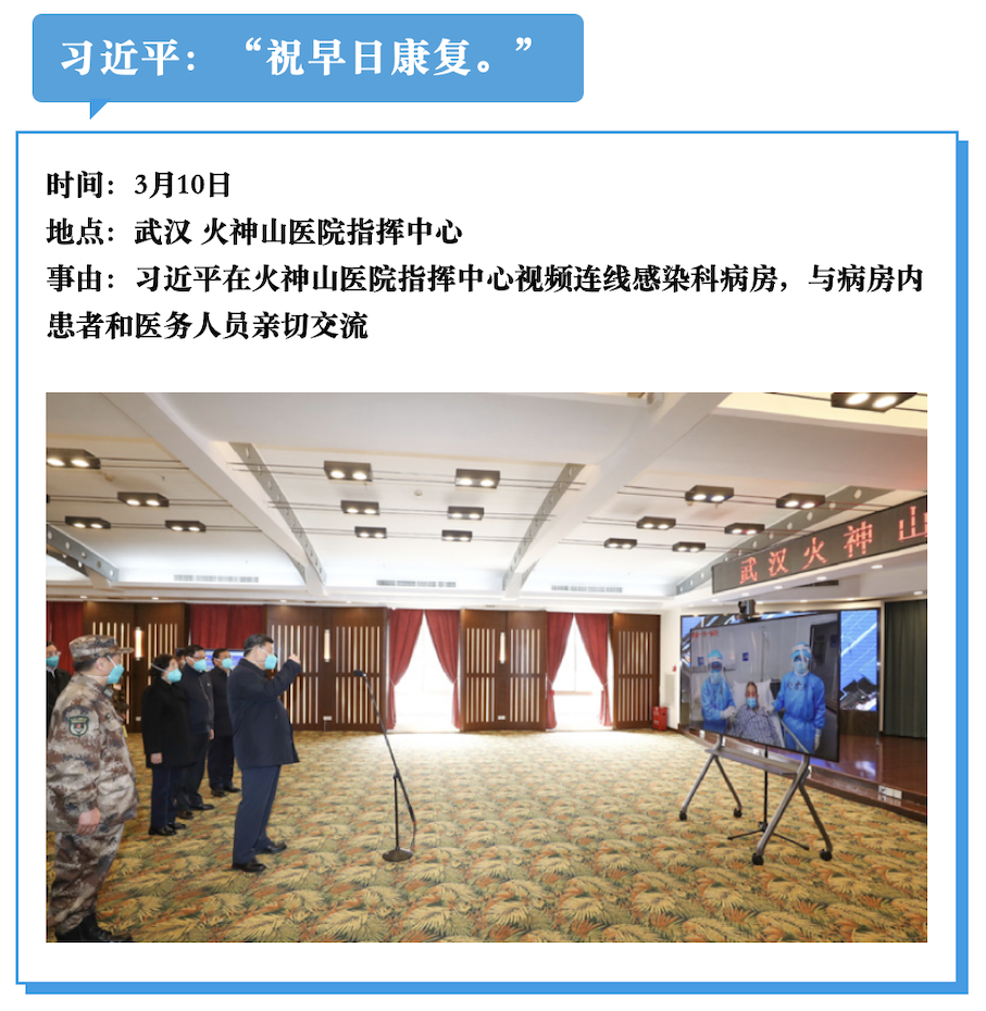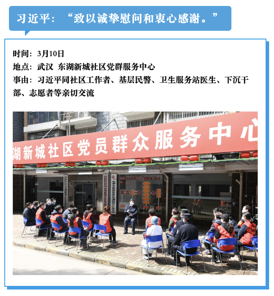 一個月后,3月10日,在抗擊新冠肺炎疫情的關(guān)鍵時刻,習近平專赴湖北省武漢市考察疫情防控工作,看望慰問奮戰(zhàn)在一線的醫(yī)務工作者、解放軍指戰(zhàn)員、社區(qū)工作者、公安干警、基層干部、下沉干部、志愿者和居民群眾。