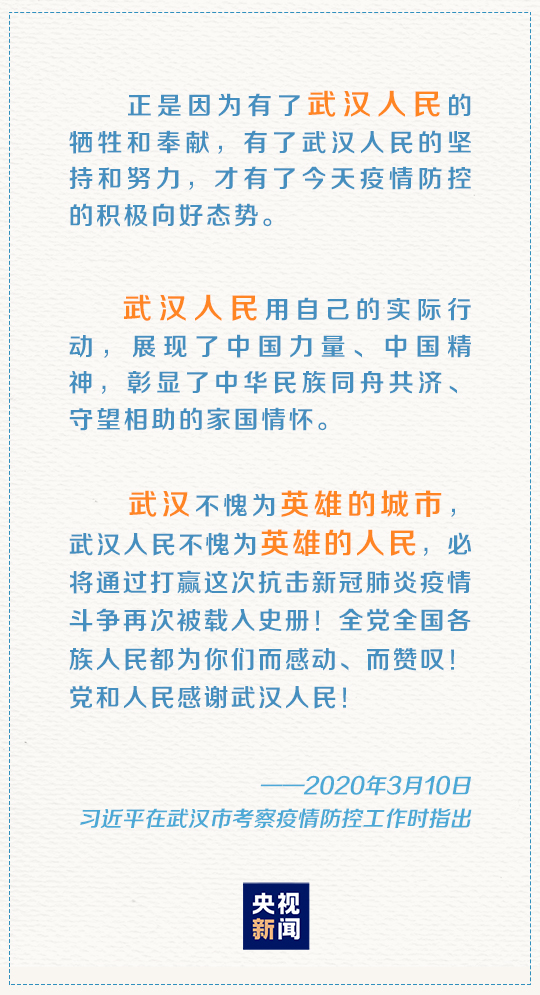 在這場嚴峻斗爭中,武漢人民識大體、顧大局,不畏艱險、頑強不屈,自覺服從疫情防控大局需要,主動投身疫情防控斗爭,作出了重大貢獻,讓全國全世界看到了武漢人民的堅韌不拔、高風亮節(jié)。