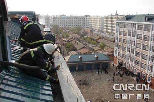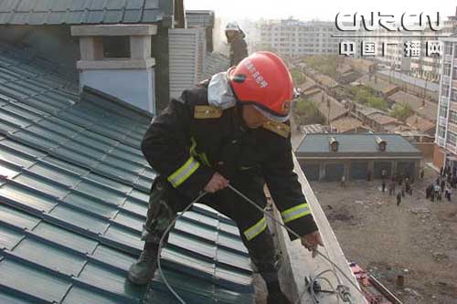 指揮員馬上聯(lián)系知情人員,上到頂樓的天窗部位觀察火勢,此時天窗已經(jīng)被上面的火焰給封住了,人員無法由天窗進(jìn)入救助。指揮員迅速將人員分為兩組,采取內(nèi)外夾攻的戰(zhàn)術(shù)進(jìn)行撲救,一組由天窗下方用水槍對悶頂?shù)幕饎萦上露线M(jìn)行掃射,澆滅天窗外圍的火勢后,上到悶頂進(jìn)行撲救。一組由外側(cè)的外掛樓梯上到頂層進(jìn)行撲救。由于樓層較高,消防官兵用安全繩將水帶、破拆用的工具等物品拉到上面。