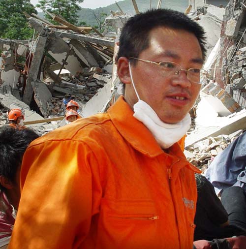 下午1點,我正要去救援現(xiàn)場時,一位老太太急著往縣城里趕,她說5月12日她到外邊走親戚,剛走到一家超市門口就地震了,幸運逃過一劫,但家人還在平武縣不知生死,她一定要趕回去尋找。我給了她餅干、火腿腸和礦泉水,祝愿老人家全家平安。