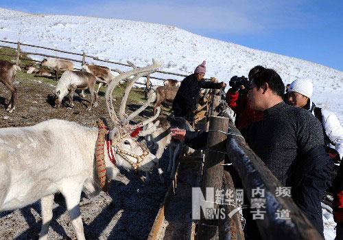 游客在呼倫貝爾牙克石鳳凰山的馴鹿養(yǎng)殖場(chǎng)和馴鹿“親密接觸”(11月27日攝)。 近年來(lái),內(nèi)蒙古著名的夏季旅游度假勝地呼倫貝爾市依托當(dāng)?shù)鬲?dú)具特色的冰雪資源和森林、口岸、民俗文化等特色優(yōu)勢(shì),大力發(fā)展冬季冰雪旅游,取得初步成效。 新華社記者任軍川攝