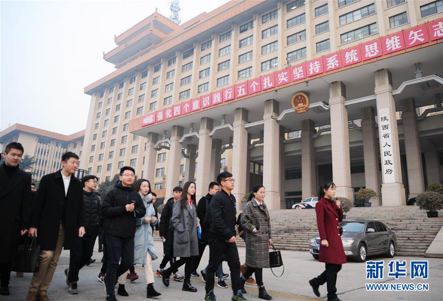 1月22日,參加寒假見習(xí)的大學(xué)生參觀陜西省人民政府辦公樓。 新華網(wǎng)消息 當(dāng)日,來自17所高校的109名大學(xué)生走進(jìn)陜西省政府大院接受培訓(xùn),他們將被分配至40個(gè)廳局部門,開始為期39天的“準(zhǔn)公務(wù)員”見習(xí)生活。新華社發(fā)(張博文 攝) -