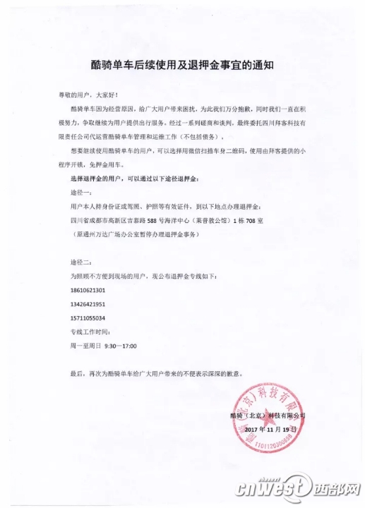 酷騎單車發(fā)布公告,稱北京已經(jīng)停止退款,現(xiàn)場(chǎng)退押金只能去成都。