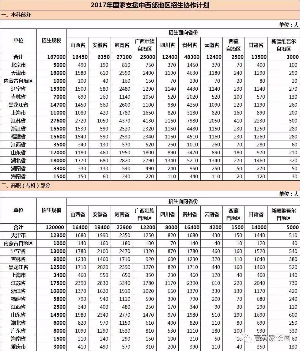 2017年,國家支援中西部地區(qū)招生協(xié)作計劃共安排28.7萬人,其中本科16.7萬人、專科12萬人,主要由公辦高校承擔。