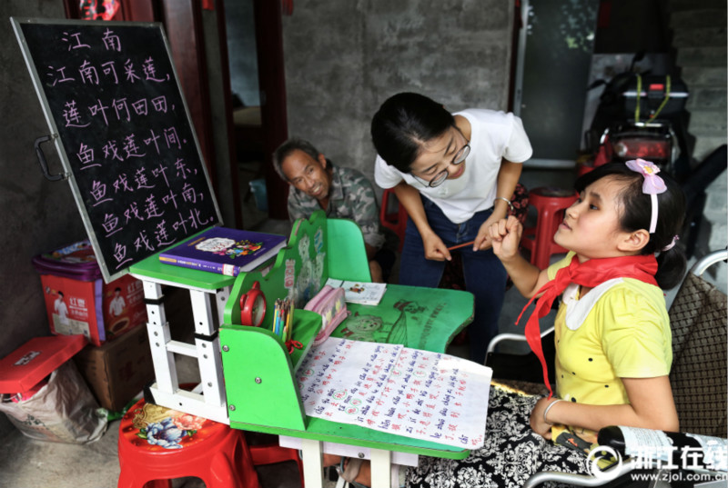 13歲的“輪椅女孩”汪凌瑩,從小遺傳母親的脆骨癥,無(wú)法站立行走,也無(wú)法上學(xué)。從2014年開(kāi)始,一支由淳安浪川鄉(xiāng)雙源完全小學(xué)的12名鄉(xiāng)村教師組成的送教隊(duì)伍,每周輪流為汪凌瑩送課上門(mén),近三年來(lái)風(fēng)雨無(wú)阻。這12位教師中,有到了退休年齡的老教師,也有剛剛加入教師隊(duì)伍的年輕90后。