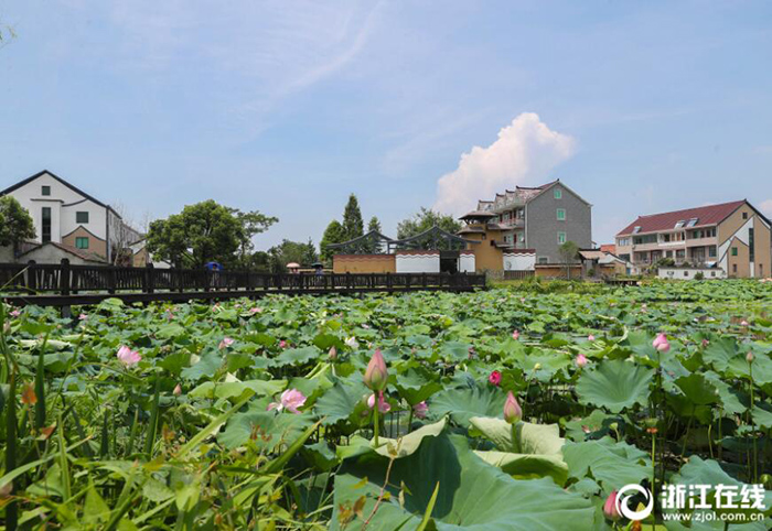 7月25日,在湖州德清下渚湖街道沿河村的小公園,廊橋、荷花、游步道相互映襯,猶如一張美麗的鄉(xiāng)村畫卷。